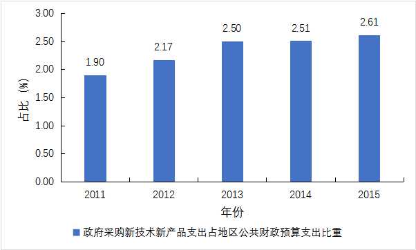圖2? 2011-2015年政府采購新技術(shù)新產(chǎn)品支出占地區(qū)公共財政預算支出比重