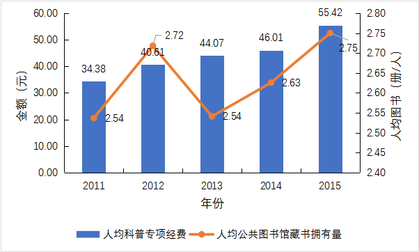 圖3 ?2011-2015年人均公共圖書館藏書擁有量和人均科普專項經(jīng)費