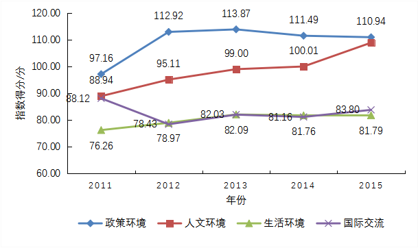 ???????從測算結(jié)果看,首都創(chuàng)新環(huán)境指數(shù)大幅增長,創(chuàng)新環(huán)境發(fā)展良好,得分從2011年的88.66分增長到2015年的97.82分,總體呈現(xiàn)不斷上升趨勢。具體到各二級指標:政策環(huán)境得分從2011到2015年有所增長,得分從97.16分增長到110.94分,該指標在2012年得分破百,并一直保持至今。2011-2015年,首都人文環(huán)境得到顯著改善,人文環(huán)境指標得分總體上保持了較快的增長勢頭,四年間得分增長了19.96分,年均增長4.99分。2015年,該指標得分108.9,同比增長8.9%,達到“十二五”時期新高。生活環(huán)境指標近兩年略有下降,但得分總體保持穩(wěn)定,從2011年的76.26分增長到2015年的81.79分,年均增長1.38分。2011年-2015年,國際交流指標總體呈現(xiàn)平穩(wěn)發(fā)展的態(tài)勢,2015年該指標得分比上年提高2.64分。