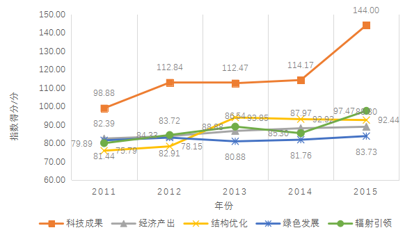 ???????從測算結果來看,首都創(chuàng)新績效指標得分穩(wěn)步提升,2015年得分100.35分,比“十二五”初期(2011年)增長20.1%,年均提高4.2分。各二級指標具體情況如下:科技成果經歷了3年平穩(wěn)發(fā)展,2015年突飛猛進,且得分最高,達到144分,較上一年增幅26.1%;輻射引領進步速度較快,達到97.47分,較上一年增幅14.3%;經濟結構得分92.44分,較上一年略微下降;經濟產出得分88.80分,與上一年基本持平;綠色發(fā)展得分83.73分,較上一年略微提高。