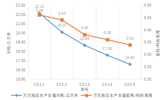 圖6 ?2011-2015年北京萬元地區(qū)生產總值水耗與萬元地區(qū)生產總值能耗