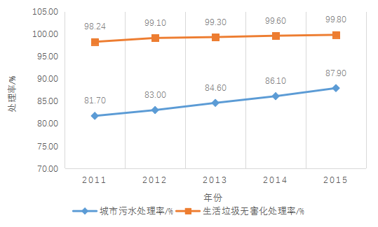 圖7 ?2011-2015年北京城市污水處理率和生活垃圾無害化處理率