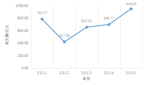 圖9 ?2011-2015年北京技術出口合同成交額/億元