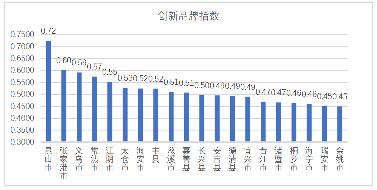 縣域創(chuàng)新品牌發(fā)展指數(shù)排名前20強(qiáng)的縣域依次為昆山市、張家港市、義烏市、常熟市、江陰市、太倉市、海安市、豐縣、慈溪市、嘉善縣、長(zhǎng)興縣、安吉縣、德清縣、宜興市、晉江市、諸暨市、桐鄉(xiāng)市、海寧市、瑞安市、余姚市。