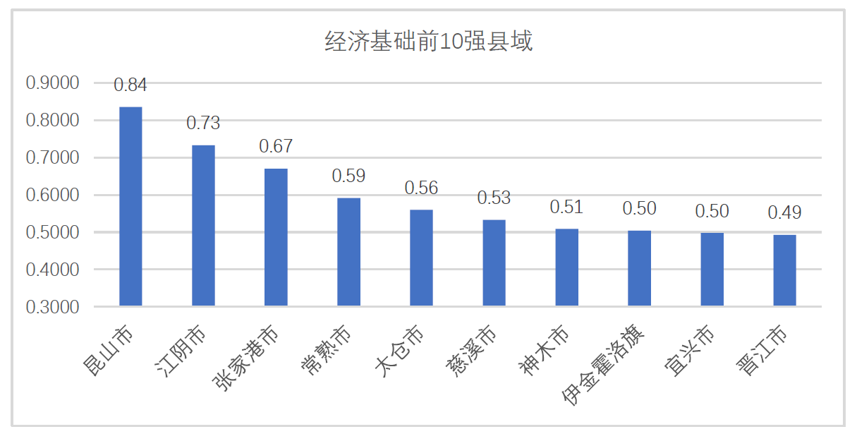 經(jīng)濟(jì)基礎(chǔ)前10強(qiáng)的縣域分別為昆山市、江陰市、張家港市、常熟市、太倉市、慈溪市、神木市、伊金霍洛旗、宜興市、晉江市。
