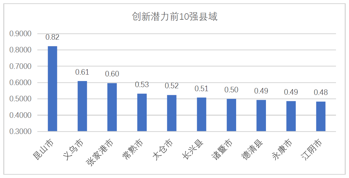 創(chuàng)新潛力前10強(qiáng)的縣域分別為昆山市、義烏市、張家港市、常熟市、太倉市、長(zhǎng)興縣、諸暨市、德清縣、永康市、江陰市。