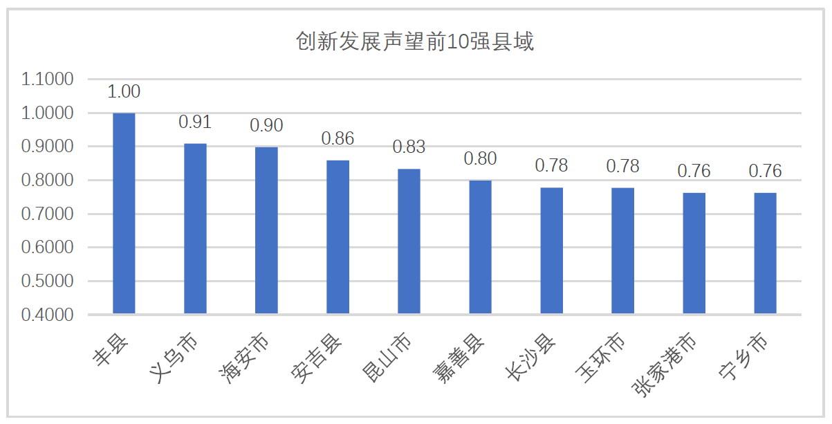 創(chuàng)新發(fā)展聲望前10強(qiáng)的縣域分別為豐縣、義烏市、海安市、安吉縣、昆山市、嘉善縣、長(zhǎng)沙縣、玉環(huán)市、張家港市、寧鄉(xiāng)市。