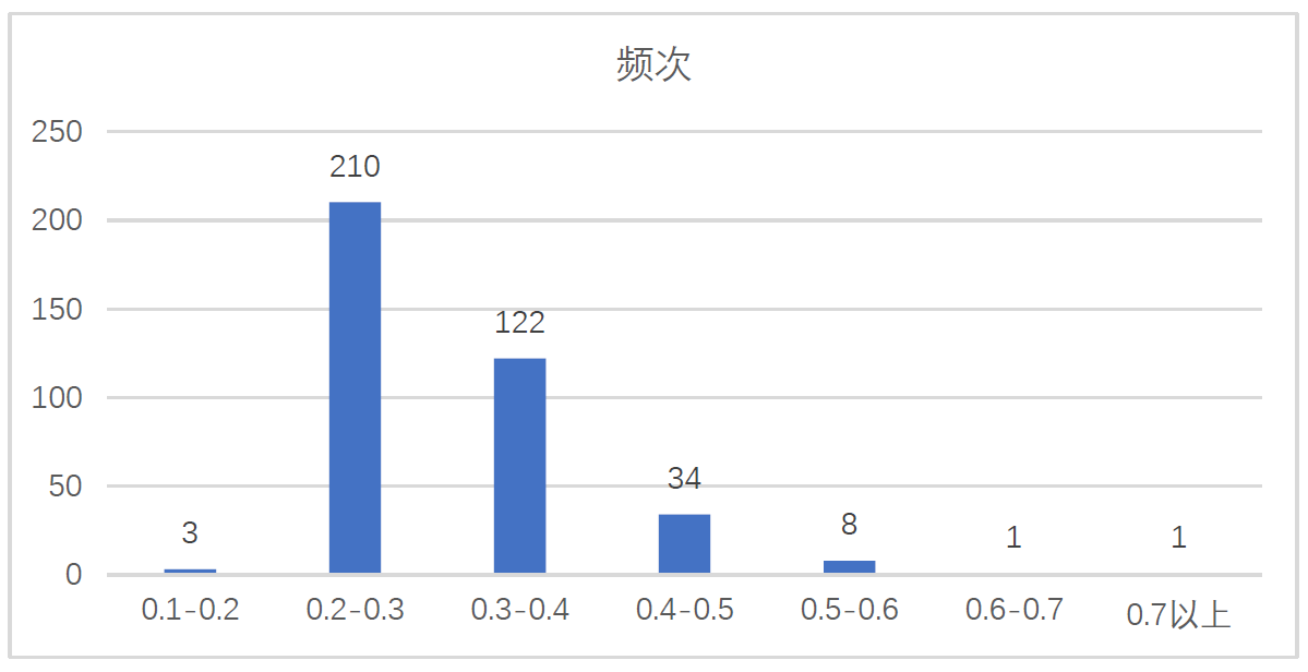 (二)縣域創(chuàng)新品牌影響力呈偏態(tài)分布,大部分集中在(0.2,0.4)區(qū)間,整體水平偏低