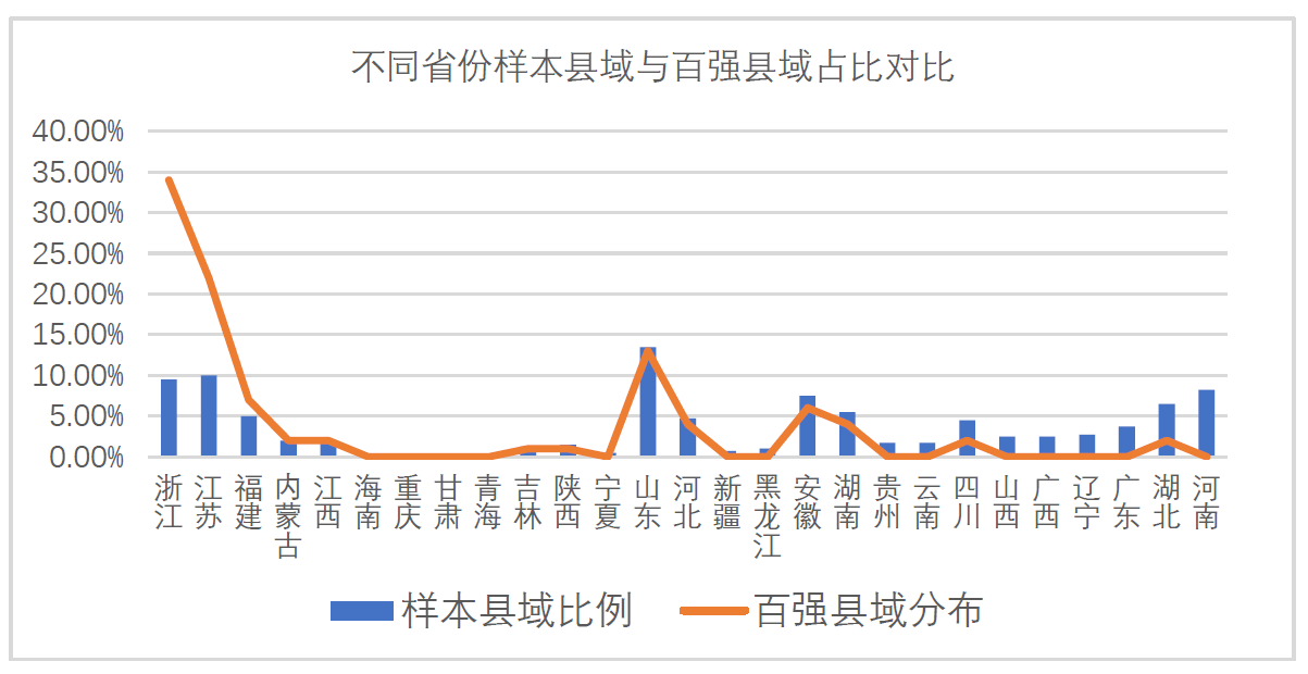 圖9 不同省份樣本縣域與百強(qiáng)縣域占比對(duì)比