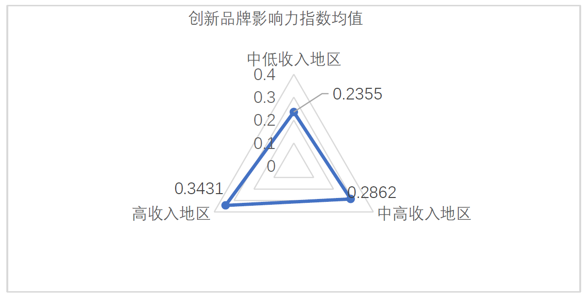 參照世界銀行區(qū)域人均GDP的劃分標(biāo)準(zhǔn),我們將400個(gè)樣本縣域劃分為3個(gè)收入層級(jí),分別為中低收入地區(qū)縣域(9個(gè))、中高收入地區(qū)縣域(287個(gè))、高收入地區(qū)縣域(104個(gè)),根據(jù)數(shù)據(jù)分析發(fā)現(xiàn),越是高收入的地區(qū)創(chuàng)新品牌影響力得分越高,由此可見,經(jīng)濟(jì)發(fā)展水平與縣域創(chuàng)新品牌效應(yīng)正相關(guān),良好的經(jīng)濟(jì)發(fā)展基礎(chǔ)是縣域創(chuàng)新品牌影響力提升的重要驅(qū)動(dòng)和支撐。