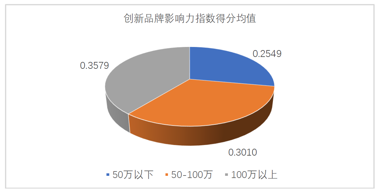 根據(jù)400個(gè)樣本縣域的人口規(guī)模分布概況,大致可劃分為3個(gè)區(qū)間,分別為50萬以下(101個(gè)),50-100萬(225個(gè)),100萬以上(74個(gè))的縣域。通過對(duì)不同規(guī)模縣域創(chuàng)新品牌得分均值的分析發(fā)現(xiàn),縣域人口規(guī)模越大,其創(chuàng)新品牌效應(yīng)越明顯,說明縣域規(guī)模的增加有利于推動(dòng)縣域創(chuàng)新品牌影響力的提升。