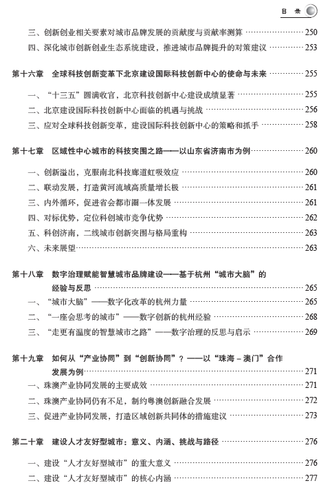 并對(duì)科學(xué)城引領(lǐng)城市融合創(chuàng)新發(fā)展提出了相關(guān)建議;第十五章為“創(chuàng)新創(chuàng)業(yè)生態(tài)系統(tǒng)建設(shè)助力城市品牌提升”,主要構(gòu)建了創(chuàng)新創(chuàng)業(yè)生態(tài)系統(tǒng)與城市品牌的邏輯關(guān)系,探討了創(chuàng)新創(chuàng)業(yè)相關(guān)要素對(duì)城市品牌發(fā)展的貢獻(xiàn)度,并提出了相關(guān)對(duì)策建議;第十六章為“全球科技創(chuàng)新變革下北京建設(shè)國(guó)際科技創(chuàng)新中心的使命與未來”,主要探討新形勢(shì)下,北京國(guó)際科技創(chuàng)新中心建設(shè)成效、面臨的機(jī)遇挑戰(zhàn)及應(yīng)對(duì)策略;第十七章為“區(qū)域性中心城市的科技突圍之路——以山東省濟(jì)南市為例”,主要梳理濟(jì)南所處空間科技發(fā)展背景,探索濟(jì)南科技突圍之路,為提高區(qū)域性中心城市科技創(chuàng)新能力、推動(dòng)區(qū)域高質(zhì)量發(fā)展提供參考;第十八章為“數(shù)字治理賦能智慧城市品牌建設(shè)——基于杭州‘城市大腦’的經(jīng)驗(yàn)與反思”,主要分析杭州市數(shù)字化改革、數(shù)字創(chuàng)新和數(shù)字治理的經(jīng)驗(yàn)與反思,為數(shù)字治理賦能智慧城市品牌建設(shè)提供有益借鑒;第十九章為“如何從‘產(chǎn)業(yè)協(xié)同’到‘創(chuàng)新協(xié)同’?——以‘珠海—澳門’合作發(fā)展為例”,主要就粵港澳大灣區(qū)建設(shè)和橫琴粵澳深度合作區(qū)建設(shè)背景下,推動(dòng)珠澳產(chǎn)業(yè)協(xié)同發(fā)展,打造區(qū)域創(chuàng)新共同體,促進(jìn)區(qū)域創(chuàng)新發(fā)展進(jìn)行探索和思考;第二十章為“建設(shè)人才友好型城市:意義、內(nèi)涵、挑戰(zhàn)與路徑”,主要探討了建設(shè)“人才友好型城市”的重大意義,研究了“人才友好型城市”的核心內(nèi)涵,并基于問題導(dǎo)向,提出了推進(jìn)建設(shè)“人才友好型城市”建設(shè)的重點(diǎn)思路。