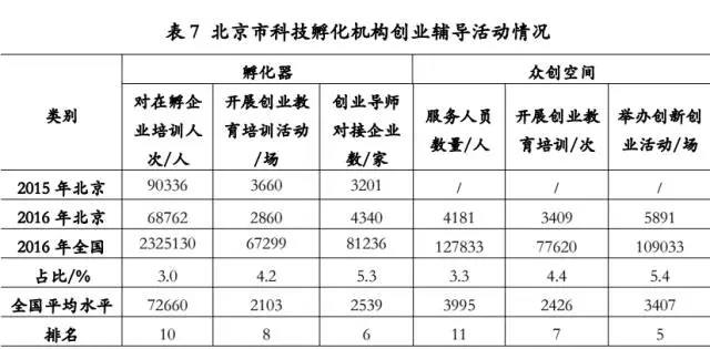總體而言,北京市創(chuàng)業(yè)孵化機(jī)構(gòu)開展的創(chuàng)業(yè)活動(dòng)較多,服務(wù)能力較強(qiáng),營造了濃厚的創(chuàng)新創(chuàng)業(yè)氛圍。數(shù)據(jù)顯示, 2016年,北京市孵化器對(duì)在孵企業(yè)培訓(xùn)人次近7萬人,開展創(chuàng)業(yè)教育培訓(xùn)活動(dòng)近3000場(chǎng),創(chuàng)業(yè)導(dǎo)師對(duì)接企業(yè)4000余家,排名第6。2016年,眾創(chuàng)空間服務(wù)人員雖然只有4000余人,全國排名第11,但舉辦創(chuàng)新創(chuàng)業(yè)活動(dòng)近6000場(chǎng),全國排名第5;開展創(chuàng)業(yè)教育培訓(xùn)3000余次,全國排名第7。同時(shí),眾創(chuàng)空間擁有創(chuàng)業(yè)導(dǎo)師4677人,全國排名第7,專職創(chuàng)業(yè)導(dǎo)師占比為17%。