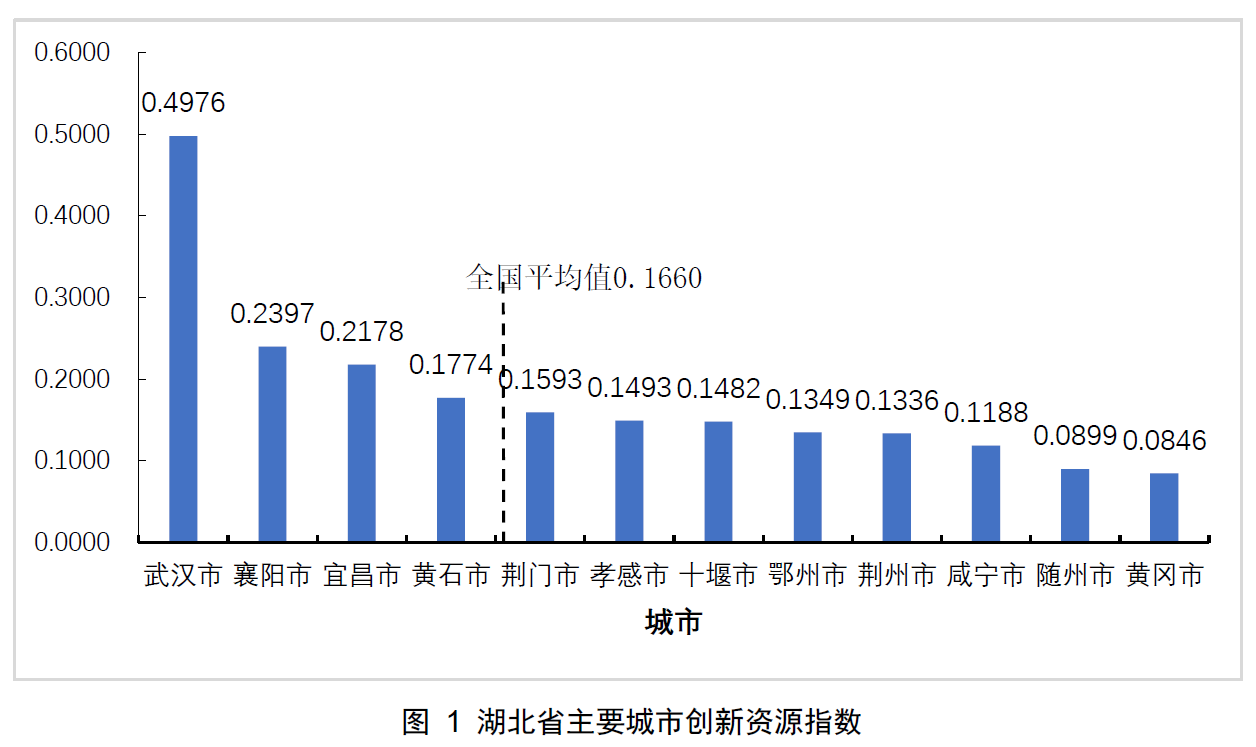? ? ? ?在創(chuàng)新資源一級指標中,湖北省各市的排名依次為:武漢、襄陽、宜昌、黃石、荊門、孝感、十堰、鄂州、荊州、咸寧、隨州和黃岡。其中武漢、襄陽、宜昌、黃石四市創(chuàng)新資源指數(shù)高于全國均值,荊門及排名在其后的城市的創(chuàng)新資源指數(shù)均低于全國均值。