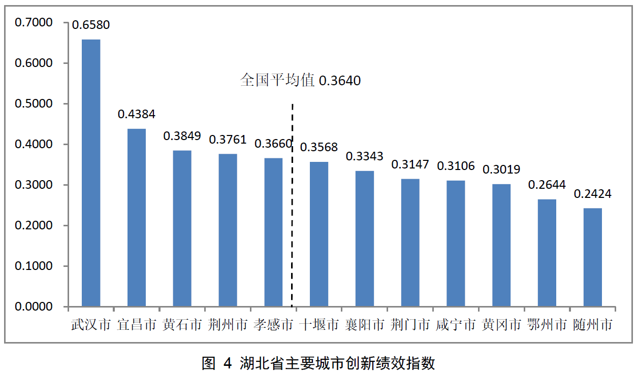 ? ? ? ?在創(chuàng)新績效一級指標中,湖北省各市的排名依次為:武漢、宜昌、黃石、荊州、孝感、十堰、襄陽、荊門、咸寧、黃岡、鄂州、隨州。其中,武漢、宜昌、黃石、荊州、孝感五市創(chuàng)新績效高于全國均值,其它鄂州及排名在其后的城市的創(chuàng)新績效指數(shù)低于全國平均值。