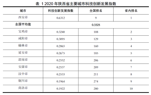 2020年度,陜西各市科技創(chuàng)新發(fā)展指數(shù)排名依次為:西安、寶雞、咸陽、榆林、延安、渭南、安康、漢中、銅川、商洛。其中只有省會西安的科技創(chuàng)新發(fā)展指數(shù)