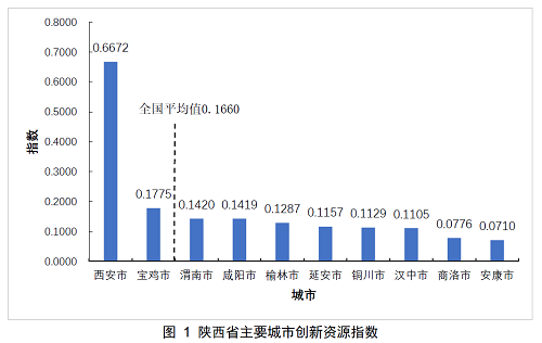 在創(chuàng)新資源一級指標(biāo)中,陜西各市的排名依次為:西安、寶雞、渭南、咸陽、榆林、延安、銅川、漢中、商洛和安康。其中渭南及排名在其后的城市的創(chuàng)新資源指數(shù)低于全國平均值。