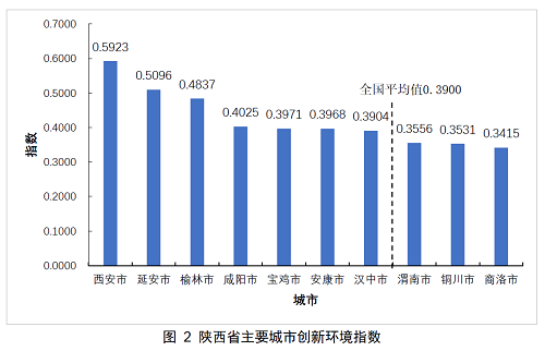 在創(chuàng)新環(huán)境一級指標(biāo)中,陜西各市的排名依次為:西安、延安、榆林、咸陽、寶雞、安康、漢中、渭南、銅川和商洛。其中渭南及排名在其后的城市的創(chuàng)新環(huán)境指數(shù)低于全國平均值。