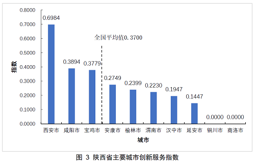 在創(chuàng)新服務(wù)一級指標(biāo)中,陜西各市的排名依次為:西安、咸陽、寶雞、安康、榆林、渭南、漢中、延安、銅川和商洛。其中安康及排名在其后的城市的創(chuàng)新服務(wù)指數(shù)低于全國平均值。