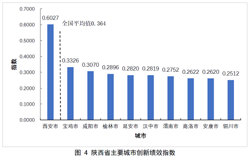 在創(chuàng)新績效一級指標(biāo)中,陜西各市的排名依次為:西安、寶雞、咸陽、榆林、延安、漢中、渭南、商洛、安康和銅川。其中只有西安的創(chuàng)新績效指數(shù)高于全國平均值。