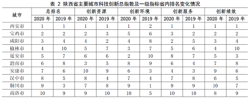 對比2020年和2019年陜西省主要城市科技創(chuàng)新發(fā)展總指數(shù)及各項一級指標(biāo)省內(nèi)排名可知,西安各項指標(biāo)在省內(nèi)均名列前茅,咸陽、榆林、延安、渭南在總排名上均有進步,安康、漢中、銅川、商洛較上年總排名有所下降。