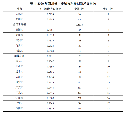 2020年度,四川各市科技創(chuàng)新發(fā)展指數(shù)排名依次為:成都、綿陽、德陽、瀘州、宜賓、自貢、內(nèi)江、攀枝花、南充、樂山、遂寧、眉山、雅安、廣安、廣元、達(dá)州、巴中、資陽。其中只有成都和綿陽的科技創(chuàng)新發(fā)展指數(shù)高于全國平均值。
