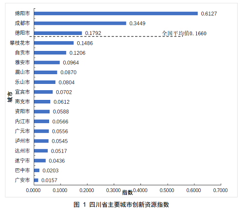 在創(chuàng)新資源一級指標(biāo)中,四川各市的排名依次為:綿陽、成都、德陽、攀枝花、自貢、雅安、眉山、樂山、宜賓、南充、資陽、內(nèi)江、廣元、瀘州、達(dá)州、遂寧、巴中和廣安。其中攀枝花及排名在其后的城市的創(chuàng)新資源指數(shù)低于全國平均值。