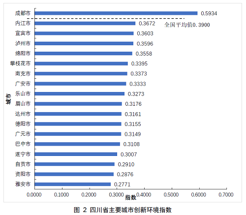 在創(chuàng)新環(huán)境一級指標(biāo)中,四川各市的排名依次為:成都、內(nèi)江、宜賓、瀘州、綿陽、攀枝花、南充、廣安、樂山、眉山、達(dá)州、德陽、廣元、巴中、遂寧、自貢、資陽和雅安。其中只有成都的創(chuàng)新環(huán)境指數(shù)高于全國平均值。