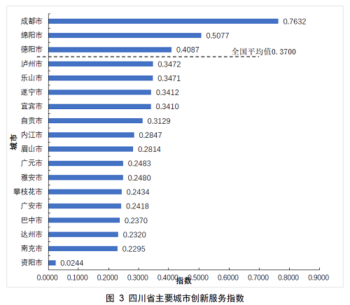 在創(chuàng)新服務(wù)一級指標(biāo)中,四川各市的排名依次為:成都、綿陽、德陽、瀘州、樂山、遂寧、宜賓、自貢、內(nèi)江、眉山、廣元、雅安、攀枝花、廣安、巴中、達(dá)州、南充和資陽。其中瀘州及排名在其后的城市的創(chuàng)新服務(wù)指數(shù)低于全國平均值。