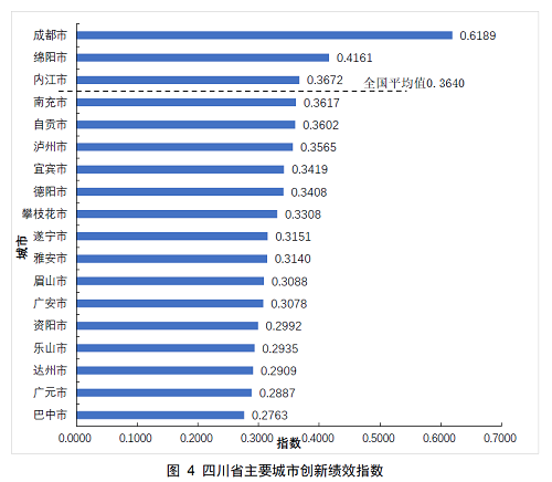 在創(chuàng)新績效一級指標(biāo)中,四川各市的排名依次為:成都、綿陽、內(nèi)江、南充、自貢、瀘州、宜賓、德陽、攀枝花、遂寧、雅安、眉山、廣安、資陽、樂山、達(dá)州、廣元和巴中。其中只有成都、綿陽、內(nèi)江三市的創(chuàng)新績效指數(shù)高于全國平均值。