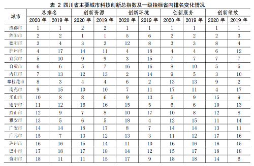 對比2020年和2019年四川省主要城市科技創(chuàng)新發(fā)展總指數(shù)及各項(xiàng)一級指標(biāo)省內(nèi)排名可知,成都各項(xiàng)指標(biāo) 保持前列,成都、綿陽 兩市總指數(shù)穩(wěn)居 前二,德陽、瀘州、宜賓、內(nèi)江、南充、遂寧、巴中