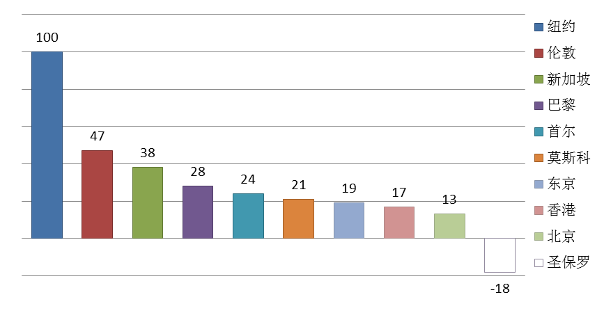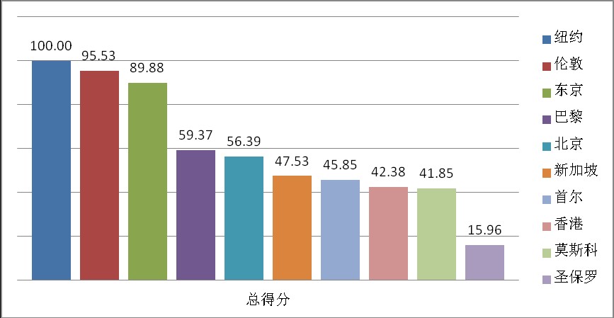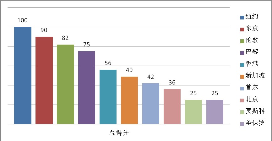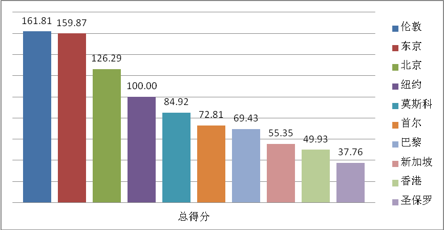 一是就得分而言,北京處于劣勢地位,得分僅為36分。通過對比,得分在75-100之間的城市有紐約、東京、倫敦和巴黎,得分在50-74之間只有香港,而得分在50分以下的城市有新加坡、首爾、北京、莫斯科和圣保羅。