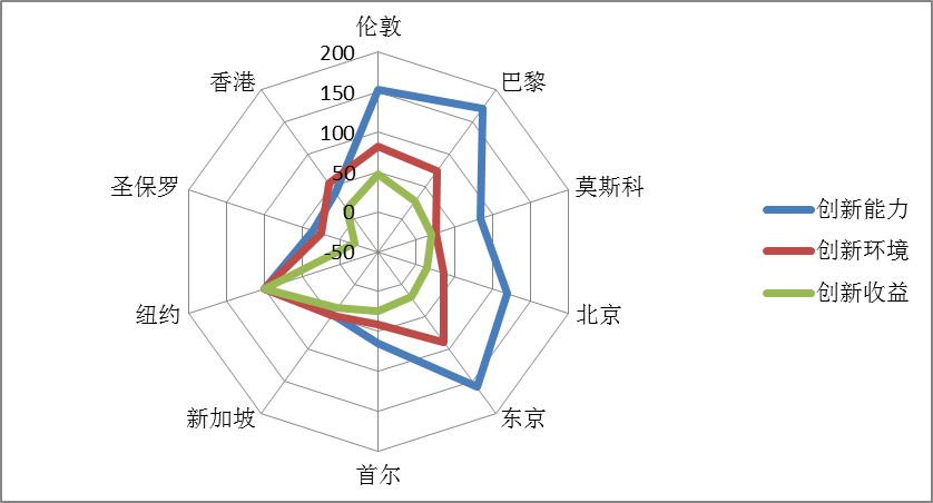 一是就得分而言,各城市在創(chuàng)新能力方面得分差距較大,北京的創(chuàng)新能力水平較高。創(chuàng)新能力指標得分可為三個區(qū)間:得分在150及以上的城市為倫敦和東京,100-150分之間的城市為北京和紐約,得分在50-100分的城市為莫斯科、首爾、新加坡,得分在50分以下的城市為香港和圣保羅。