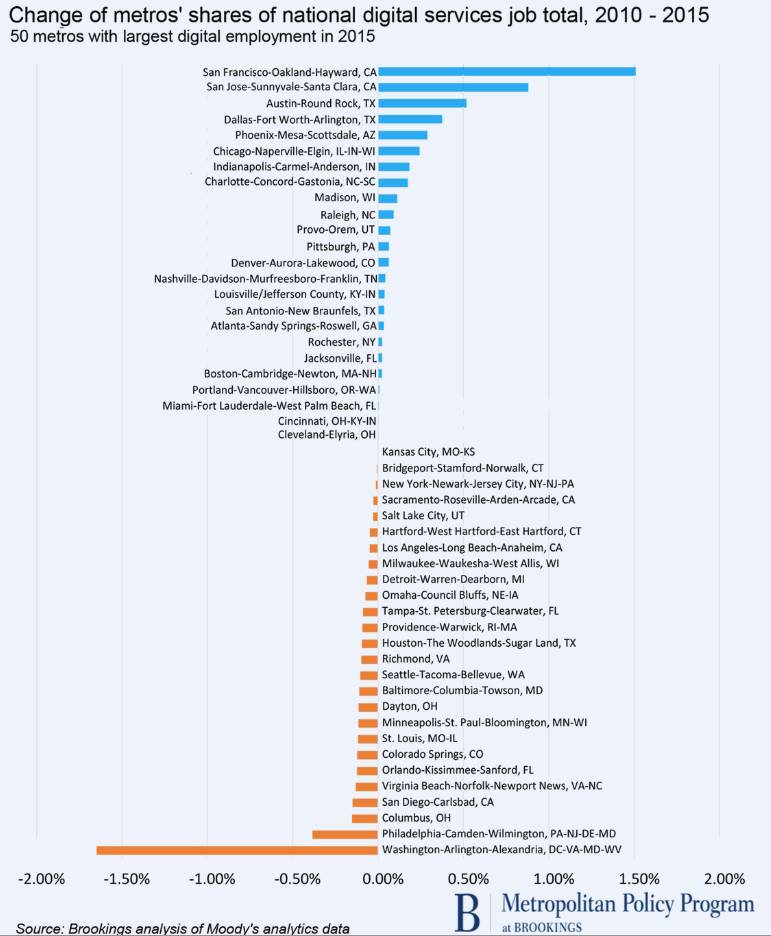 ????????自2010以來,只有極少數(shù)的大都市的數(shù)字化服務(wù)產(chǎn)業(yè)國家份額明顯增加。具體來說,2010年到2015年,美國百大城市中,排名前5的城市占據(jù)全國科技增長份額的28%。舊金山和圣何塞已經(jīng)控制了該產(chǎn)業(yè)幾十年并建立了自己的地位。美國次貸危機后,舊金山和圣何塞兩個地區(qū)創(chuàng)造的工作崗位占美國科技領(lǐng)域所提供的工作崗位總數(shù)的17%。其中舊金山提供了全國數(shù)字化服務(wù)產(chǎn)業(yè)新增崗位的10%(67000人),國家占比上升了1.5%。圣何塞增加了1000個新的數(shù)字化服務(wù)工作崗位(全國占比7.6%),占比提高0.9%。總之,舊金山灣中心地區(qū)占據(jù)了全國數(shù)字化服務(wù)就業(yè)人數(shù)的10%,高于2013年的9%和2010年的7.7%。