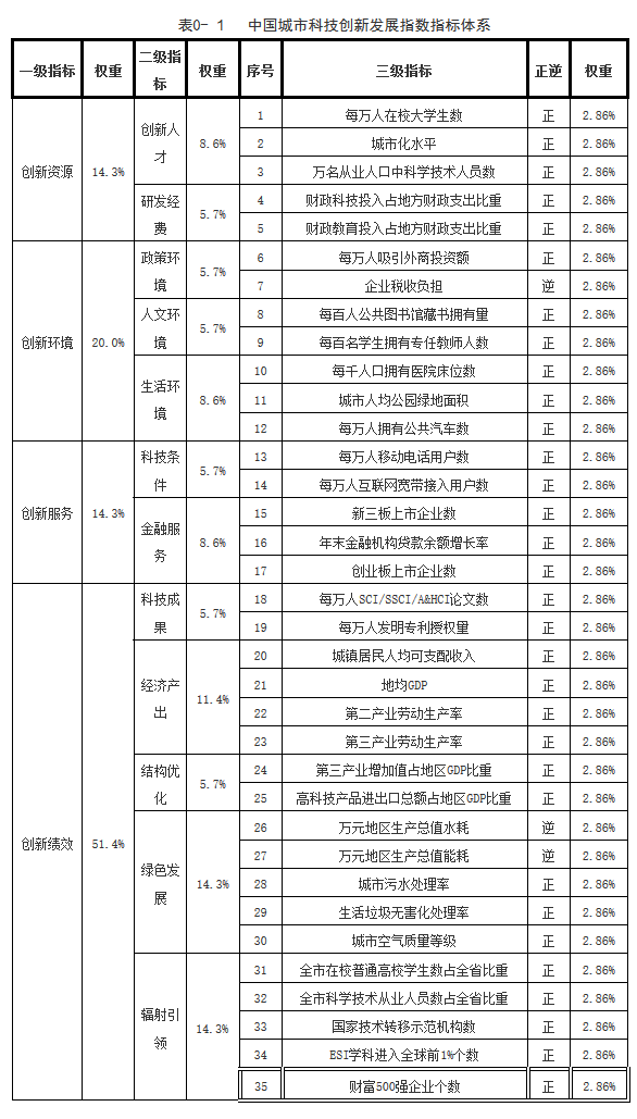 基于國內(nèi)外主要機(jī)構(gòu)創(chuàng)新評價研究報告和主要指標(biāo),本文按照科學(xué)性和兼容并包性原則、系統(tǒng)優(yōu)化和可操作性原則、可比性和一致性原則、政策性和導(dǎo)向性原則,構(gòu)建由三個層次指標(biāo)構(gòu)成的中國城市科技創(chuàng)新發(fā)展指數(shù)指標(biāo)體系,以綜合反映中國城市之間的創(chuàng)新發(fā)展差異。其中,一級指標(biāo)共4個,主要包括創(chuàng)新資源、創(chuàng)新環(huán)境、創(chuàng)新服務(wù)、創(chuàng)新績效。二級指標(biāo)共12個,主要包括創(chuàng)新人才、研發(fā)經(jīng)費(fèi)、政策環(huán)境、人文環(huán)境、生活環(huán)境、科技條件、金融服務(wù)、科技成果、經(jīng)濟(jì)產(chǎn)出、結(jié)構(gòu)優(yōu)化、綠色發(fā)展、輻射引領(lǐng)。三級指標(biāo)共35個,主要包括創(chuàng)新資源三級指標(biāo)5個,創(chuàng)新環(huán)境三級指標(biāo)7個,創(chuàng)新服務(wù)三級指標(biāo)5個,創(chuàng)新績效三級指標(biāo)18個。中國城市科技創(chuàng)新發(fā)展指數(shù)指標(biāo)體系及各指標(biāo)權(quán)重如表1所示。