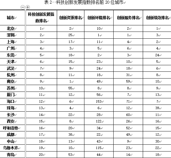 科技創(chuàng)新發(fā)展指數(shù)綜合排名結(jié)果顯示,排名前10的城市分別是北京、深圳、上海、廣州、東莞、天津、武漢、杭州、南京和蘇州;排名后10位(從278至287)的城市分別是黑河、瀘州、贛州、平?jīng)觥足y、荊州、周口、鶴崗、昭通和隴南。
