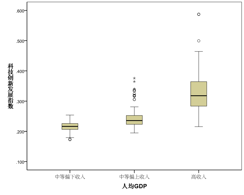 通過箱線圖刻畫處于不同經(jīng)濟(jì)發(fā)展階段城市的科技創(chuàng)新發(fā)展?fàn)顩r,圖7顯示,中等偏下收入組城市的科技創(chuàng)新發(fā)展水平基本上均低于全國平均水平,中等偏上收入組城市的科技創(chuàng)新發(fā)展多數(shù)處于全國平均水平,高收入組城市的科技創(chuàng)新發(fā)展絕大多數(shù)高于全國平均水平。可以看出,同相關(guān)性分析結(jié)果一致,城市經(jīng)濟(jì)發(fā)展水平越高,其科技創(chuàng)新發(fā)展水平越高。
