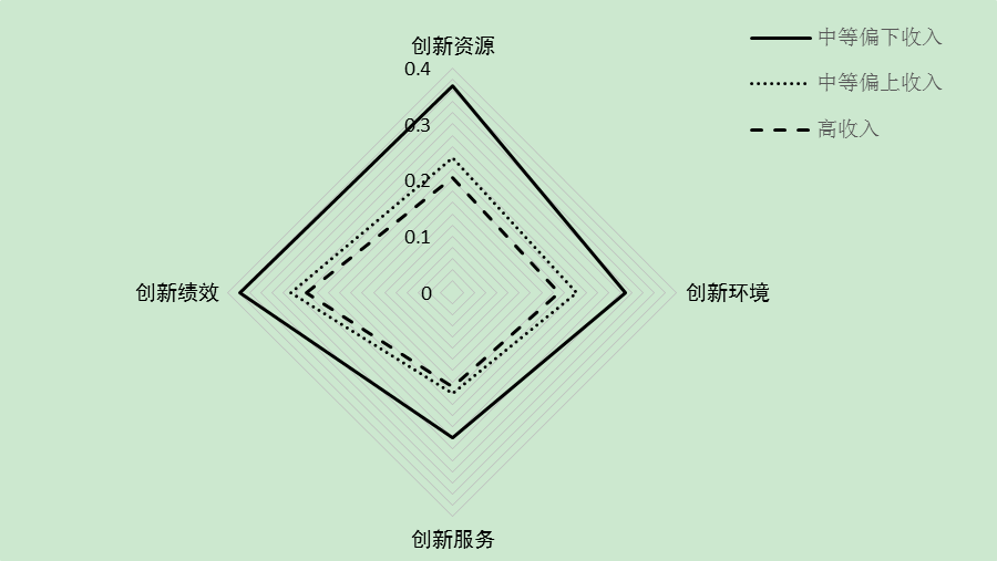 圖8顯示,高收入組城市的創(chuàng)新資源、創(chuàng)新環(huán)境、創(chuàng)新服務(wù)和創(chuàng)新績效的發(fā)展相對較為均衡,四項一級指標(biāo)均明顯高于中等收入水平城市。經(jīng)濟(jì)發(fā)展為科技創(chuàng)新體系提供物質(zhì)保障,進(jìn)而在相當(dāng)程度上影響城市的科技創(chuàng)新發(fā)展整體水平,但一個城市為科技創(chuàng)新發(fā)展的環(huán)境和服務(wù)如何,除了受經(jīng)濟(jì)發(fā)展水平的制約以外,還與城市政府的創(chuàng)新意識和主觀能動性密切相關(guān)。城市改善創(chuàng)新服務(wù)和創(chuàng)新環(huán)境是中等收入水平城市未來吸引創(chuàng)新要素、提升創(chuàng)新績效、進(jìn)而提高科技創(chuàng)新發(fā)展整體水平的重要突破點(diǎn)和著力點(diǎn)。