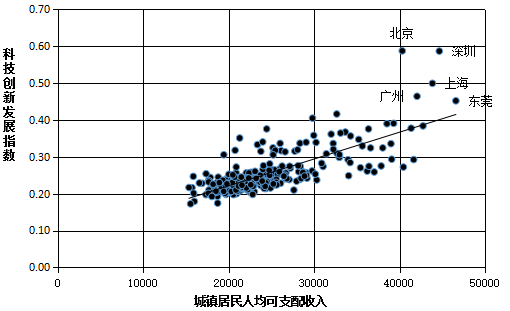 研究發(fā)現(xiàn),居民可支配收入對城市科技創(chuàng)新發(fā)展指數(shù)有顯著的正向影響。盡管統(tǒng)計數(shù)據(jù)表明,城鎮(zhèn)居民人均可支配收入近年來不斷增加,但人均消費(fèi)支出也大幅增長。現(xiàn)有財富分配體系中,政府、企業(yè)收入占國民收入的比重不斷上升,一次收入分配中居民收入比重長期偏低,在科研成果轉(zhuǎn)化收入及科研經(jīng)費(fèi)分配中,最終歸于資本方的比重過高。城市科技創(chuàng)新發(fā)展指數(shù)表明,一個城市的居民可支配收入水平越高,創(chuàng)新人才收入越高,越能吸引聚集人力資本這一科技創(chuàng)新的核心要素,城市科技創(chuàng)新發(fā)展水平越高。為此,應(yīng)當(dāng)建立鼓勵科技創(chuàng)新人員的收入分配制度,提升科研經(jīng)費(fèi)預(yù)算中的人力資本投入比重,大幅提高創(chuàng)新人才收入水平。