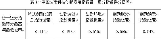 研究表明,城市間的科技創(chuàng)新發(fā)展水平存在顯著差異,科技創(chuàng)新發(fā)展指數(shù)排名靠后的城市往往在各項指標(biāo)上均落后于科技創(chuàng)新發(fā)展指數(shù)領(lǐng)先城市。從各城市一級分指數(shù)得分的極差來看(表4),創(chuàng)新服務(wù)指數(shù)的極差在四項一級分指數(shù)中位居第二,達(dá)0.596,成為影響城市科技創(chuàng)新發(fā)展的重要原因。
