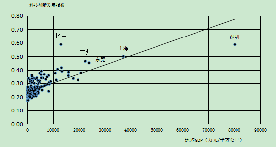 圖12 ?城市科技創(chuàng)新發(fā)展指數(shù)與地均GDP關(guān)系分布圖