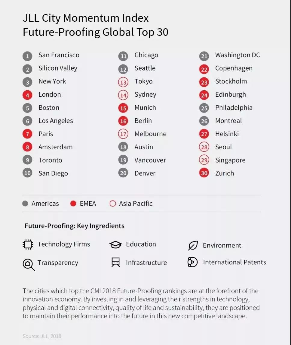 近日,房地產(chǎn)專業(yè)服務(wù)和投資管理公司仲量聯(lián)行(JLL)公布2018年“城市動(dòng)力指數(shù)”(City Momentum Index),雖然中國(guó)、印度、越南等活躍經(jīng)濟(jì)體的多個(gè)城市登上“短期動(dòng)力城市榜”,但考察一個(gè)城市前瞻性的“面向未來城市榜”仍然被歐美國(guó)家的城市所主導(dǎo)。美國(guó)舊金山、硅谷和紐約包攬了“面向未來城市榜”前三名,緊隨其后是倫敦、波士頓、洛杉磯、巴黎、阿姆斯特丹、多倫多和圣迭戈。榜單包含了30個(gè)城市,其中足足有15個(gè)來自北美。亞太地區(qū)上榜的城市有東京、悉尼、墨爾本、首爾和新加坡。