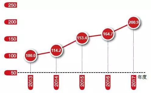 11月2日,被譽(yù)為我國(guó)高新技術(shù)產(chǎn)業(yè)園區(qū)發(fā)展的“晴雨表”和“風(fēng)向標(biāo)”的“中關(guān)村指數(shù)2018”在京發(fā)布。該指數(shù)由2013年的100提升到2017年的200.9,年均提高25.2。從五個(gè)分項(xiàng)指數(shù)看,雙創(chuàng)生態(tài)指數(shù)增勢(shì)強(qiáng)勁,達(dá)406.3,位居第一;開放協(xié)同指數(shù)、創(chuàng)新引領(lǐng)指數(shù)和高質(zhì)量發(fā)展指數(shù)快速增長(zhǎng),分別為170.7、166.7和151.6;宜居宜業(yè)指數(shù)平穩(wěn)增長(zhǎng),為109.2。“中關(guān)村指數(shù)”由中關(guān)村創(chuàng)新發(fā)展研究院和北京方迪經(jīng)濟(jì)發(fā)展研究院共同研究編制。