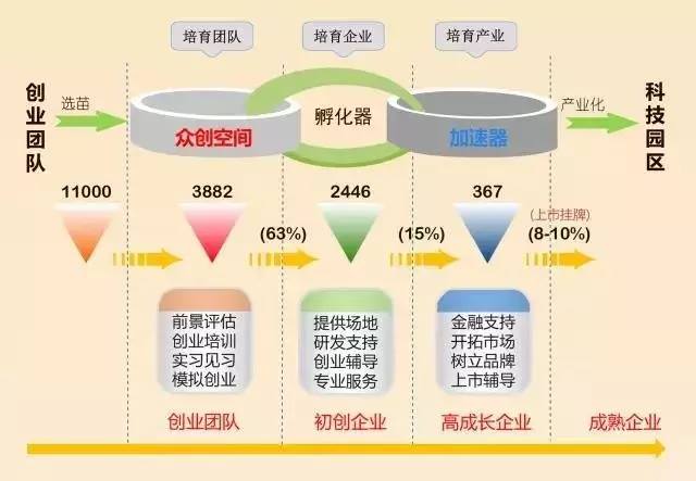 大概在10年前,中國(guó)出現(xiàn)加速器,就是服務(wù)于擴(kuò)張期企業(yè)的機(jī)構(gòu)。其邏輯是,孵化器畢業(yè)的企業(yè)往往進(jìn)入擴(kuò)張期,但還沒(méi)到可以自己購(gòu)房或者拿地的程度,因此需要有人在大規(guī)模生產(chǎn)、大規(guī)模經(jīng)營(yíng)管理團(tuán)隊(duì)辦公等方面提供幫助,這就是加速器的職能。在這個(gè)意義上,加速器是介于孵化器和科技園之間的組織。這一概念被主管部門(mén)所接受,繼而提出了苗圃、孵化器、加速器構(gòu)成創(chuàng)業(yè)孵化鏈條的理念。
