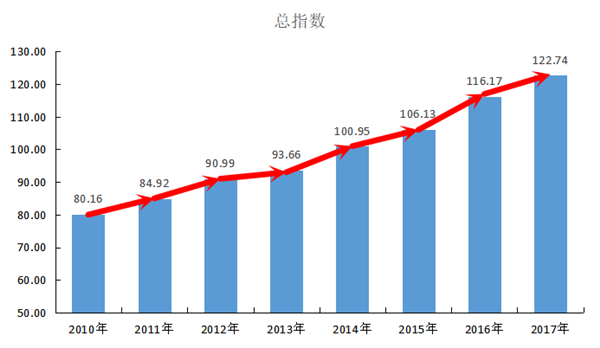 ???????2014年以來,北京全面加強全國科技創(chuàng)新中心建設,各項創(chuàng)新指標突飛猛進,一系列具有國際影響力的重大原創(chuàng)科技成果不斷涌現(xiàn)。從數(shù)據(jù)上看,2014-2017年,首科指數(shù)增長態(tài)勢明顯(如下圖),總指數(shù)得分從2014年的100.95分增長到2017年達到122.74分,年均增長7.26分,明顯高于2010-2013年的年均增長分4.50。自2014年以來,首都科技創(chuàng)新發(fā)展勢頭強勁,全國科技創(chuàng)新中心建設提速明顯,科技創(chuàng)新支撐首都經(jīng)濟社會發(fā)展力度不斷增強,北京正闊步邁入以創(chuàng)新驅動高質量發(fā)展的新階段。