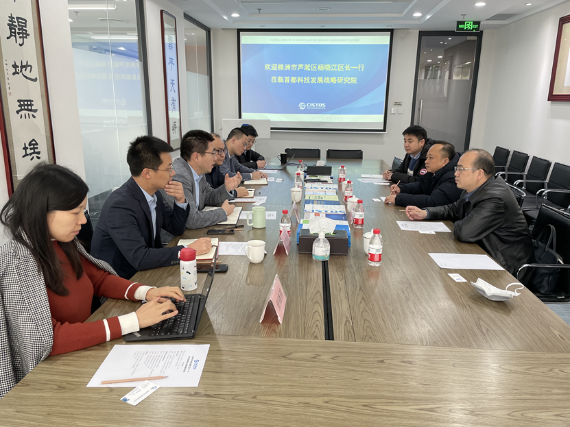 2020年12月20日,湖南省株洲市蘆淞區(qū)區(qū)委副書記、區(qū)長楊曉江,株洲新蘆淞產(chǎn)業(yè)發(fā)展集團(tuán)黨委副書記、總經(jīng)理余路文一行到訪首都科技發(fā)展戰(zhàn)略研究院。我院副院長趙崢、首科創(chuàng)新資本總經(jīng)理柳龍濤等出席會議。雙方聚焦株洲市航空科創(chuàng)園,圍繞科創(chuàng)服務(wù)體系完善、產(chǎn)業(yè)基金投資和園區(qū)運(yùn)營模式創(chuàng)新等方面,為助力園區(qū)打造成為集招商引智、創(chuàng)業(yè)孵化、產(chǎn)業(yè)加速為一體的湖南省科技創(chuàng)新發(fā)展示范基地進(jìn)行深入交流和探討。