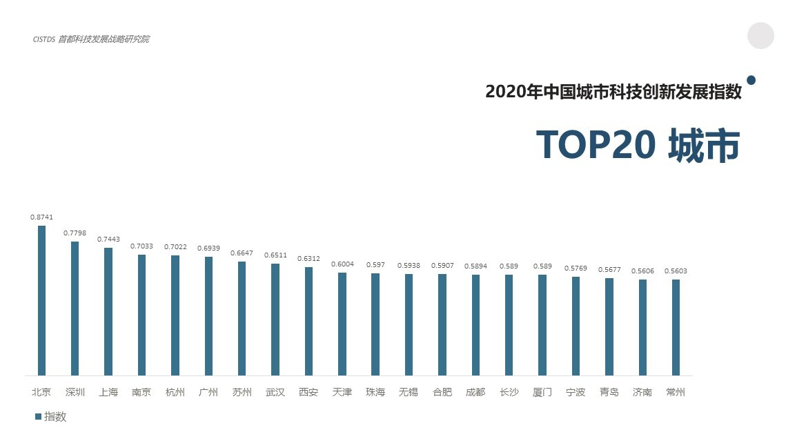 2020年中國城市科技創(chuàng)新發(fā)展指數(shù)排名前20的城市依次為北京、深圳、上海、南京、杭州、廣州、蘇州、武漢、西安、天津、珠海、無錫、合肥、成都、長沙、廈門、寧波、青島、濟(jì)南、常州。
