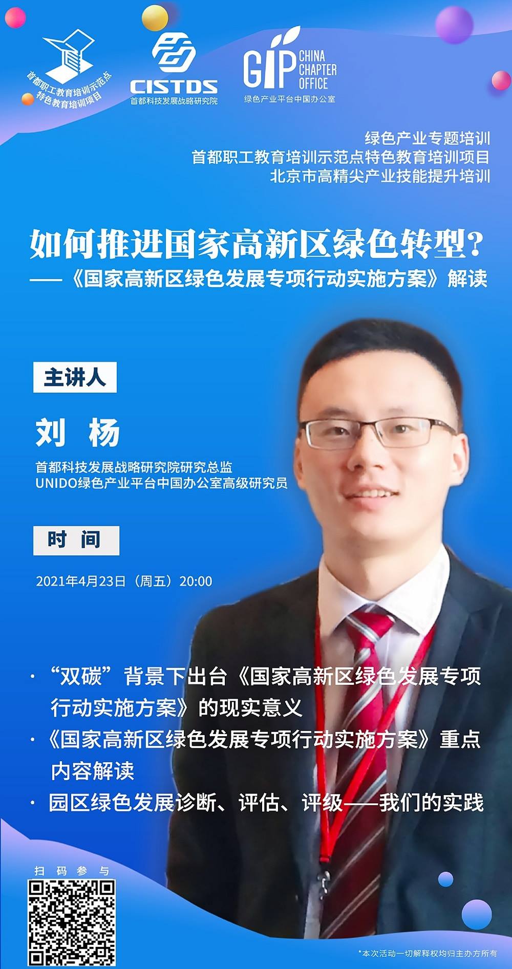 首都科技發(fā)展戰(zhàn)略研究院聯(lián)合綠色產(chǎn)業(yè)平臺中國辦公室舉辦綠色產(chǎn)業(yè)專題培訓,由首都科技發(fā)展戰(zhàn)略研究院研究總監(jiān)、聯(lián)合國工業(yè)發(fā)展組織綠色產(chǎn)業(yè)平臺中國辦公室高級研究員劉楊,聚焦如何推進國家高新區(qū)綠色轉(zhuǎn)型,解讀《國家高新區(qū)綠色發(fā)展專項行動實施方案》。