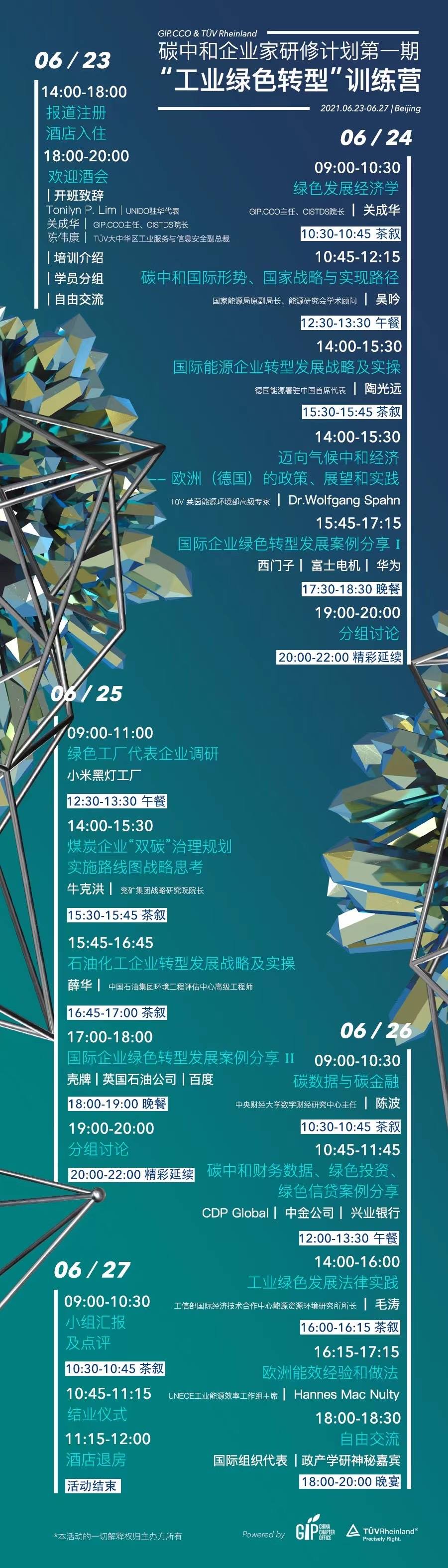 第一期“工業(yè)綠色轉(zhuǎn)型”訓(xùn)練營(yíng) 實(shí)行 小班制,融合 專家授課、企業(yè)分享、實(shí)地調(diào)研、小組討論 等多種方式進(jìn)行。訓(xùn)練營(yíng)分期舉辦,第一期名額限定 30人,營(yíng)員原則上必須是 工業(yè)企業(yè)高管,參與研修還可獲得聯(lián)合國(guó)工業(yè)發(fā)展組織綠色產(chǎn)業(yè)平臺(tái) 免費(fèi)一年會(huì)員服務(wù)。