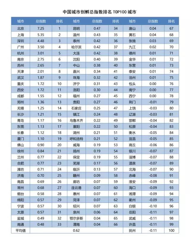 表 中國城市創(chuàng)孵總指數(shù)排名TOP100城市